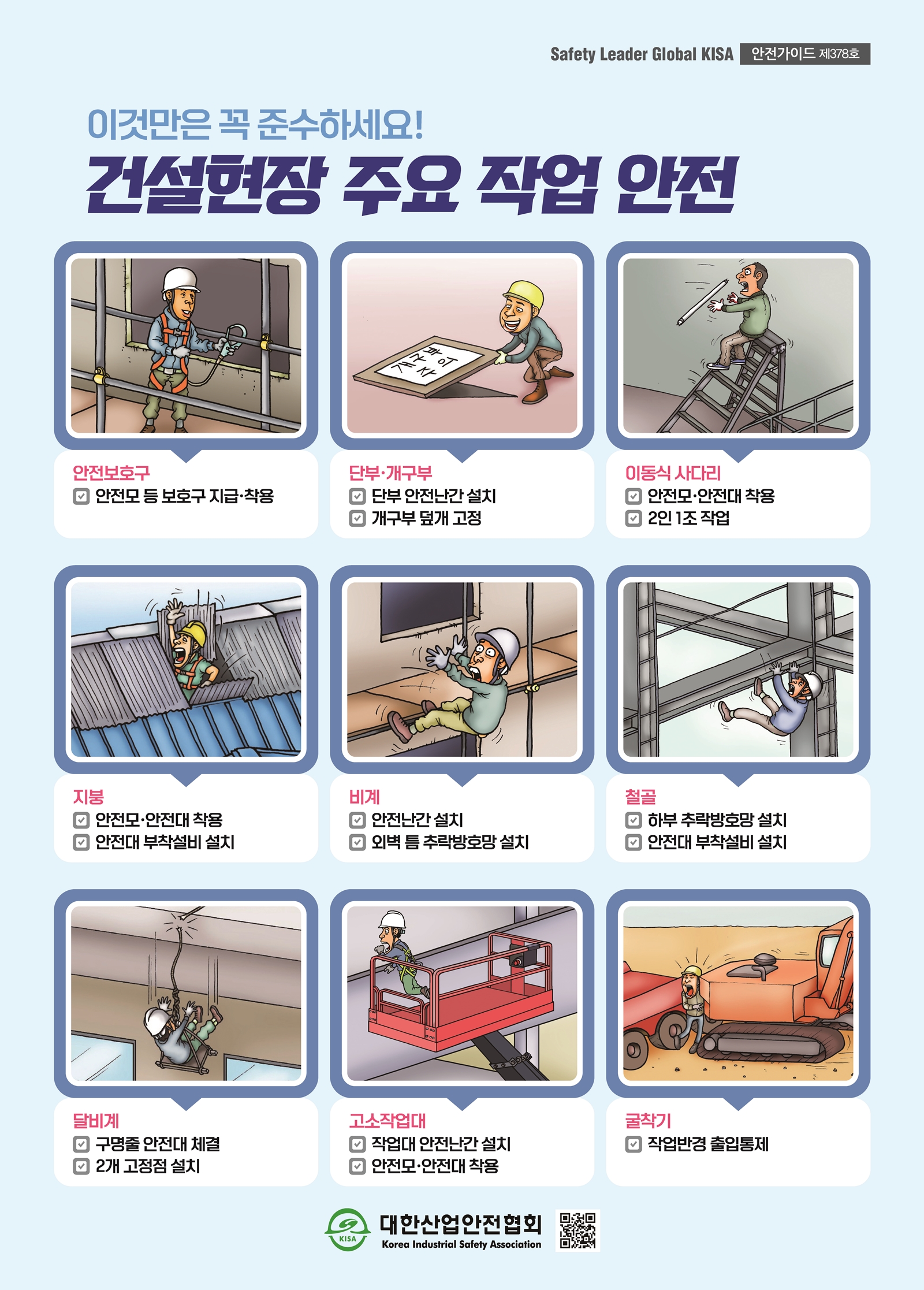 안전포스터 안전포스터 안전보건표지 교육자료 재해사례 서식자료 건설 현장 주요 작업 안전 ⓒ 대한산업안전협회 ∥ 무단도용, 복제 및 재배포 금지 제378호_건설현장 주요 작업 안전.jpg 이전글 통로 및 계단 넘어짐 사고 예방 다음글 폭염대비 온열질환 예방수칙 목록