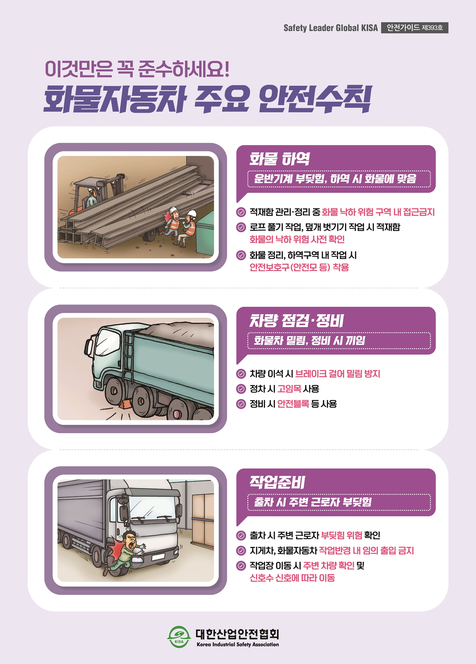 안전포스터 안전포스터 안전보건표지 교육자료 재해사례 서식자료 화물자동차 주요 안전수칙 ⓒ 대한산업안전협회 ∥ 무단도용, 복제 및 재배포 금지 제393호_화물자동차 주요 안전수칙.jpg 이전글 감전 사고 예방을 위한 안전수칙 다음글 해빙기 건설현장 안전수칙 목록