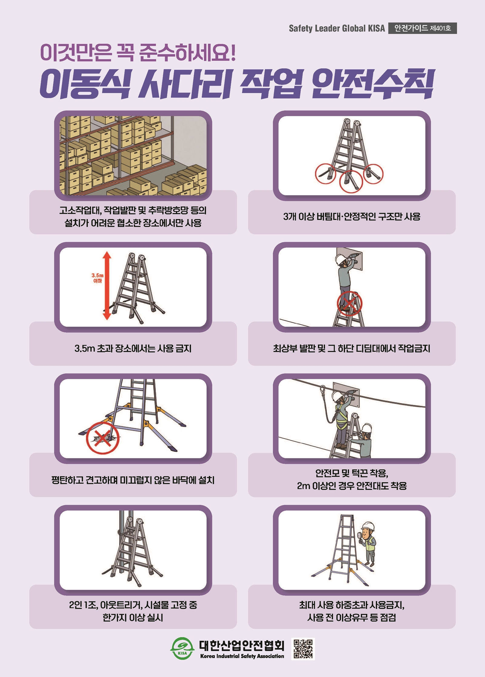 안전포스터 안전포스터 안전보건표지 교육자료 재해사례 서식자료 이동식 사다리 작업 안전수칙 ⓒ 대한산업안전협회 ∥ 무단도용, 복제 및 재배포 금지 제401호_이동식 사다리 작업 안전수칙.jpg 이전글 화학물질 취급 안전수칙 다음글 건설현장 떨어짐 사고 예방 목록