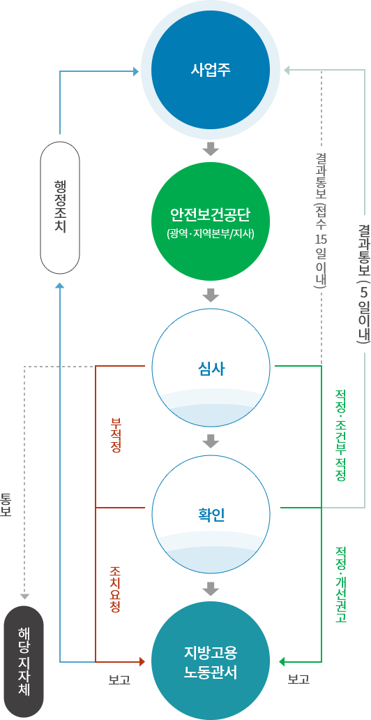 사엄주 > 안전보건공단(광역 · 지역본부/지사) > 심사(적정·조건부 적정 시 확인 후 보고/부적정시 조치요청 후 보고) > 확인 > 지방고용 노동 관서