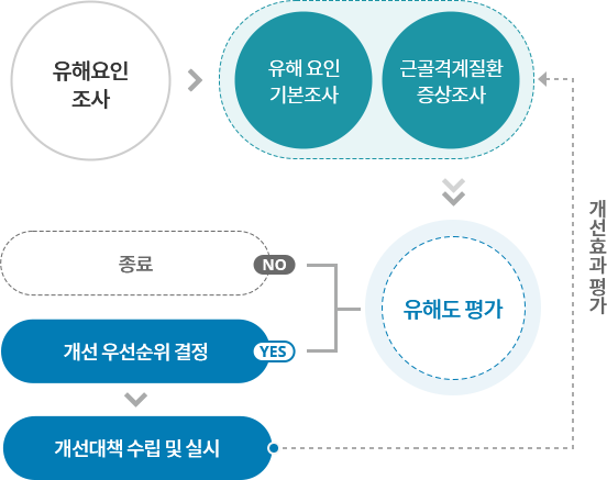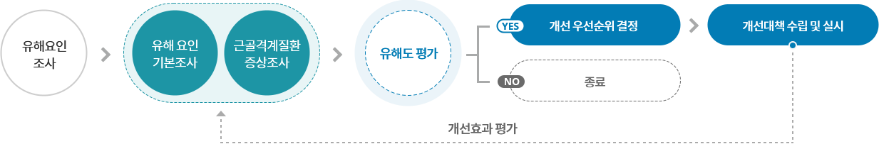 근로자의 작업 형태 등을 파악·조사해 단순 반복작업 또는 인체에 과도한 부담을 주는 작업으로 인한 근로자에게 건강장해 발생 위험을 차단하고 있습니다.