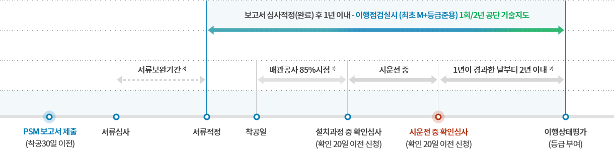 PSM보고서의 제출시기, 설치과정 · 시운전 중 및 이행상태점검 및 평가 시기는 관련법령, 고시 및 KOSHA GUIDE에 의거 아래와 같음