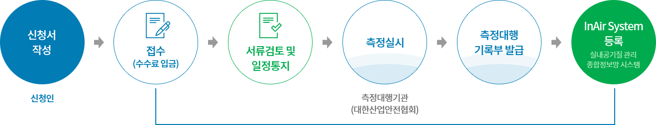 | 제출서류 | 실내공기질 측정 신청서, 설계도면, 사업자등록증(고유번호증) | 실내공기질측정신청서 |