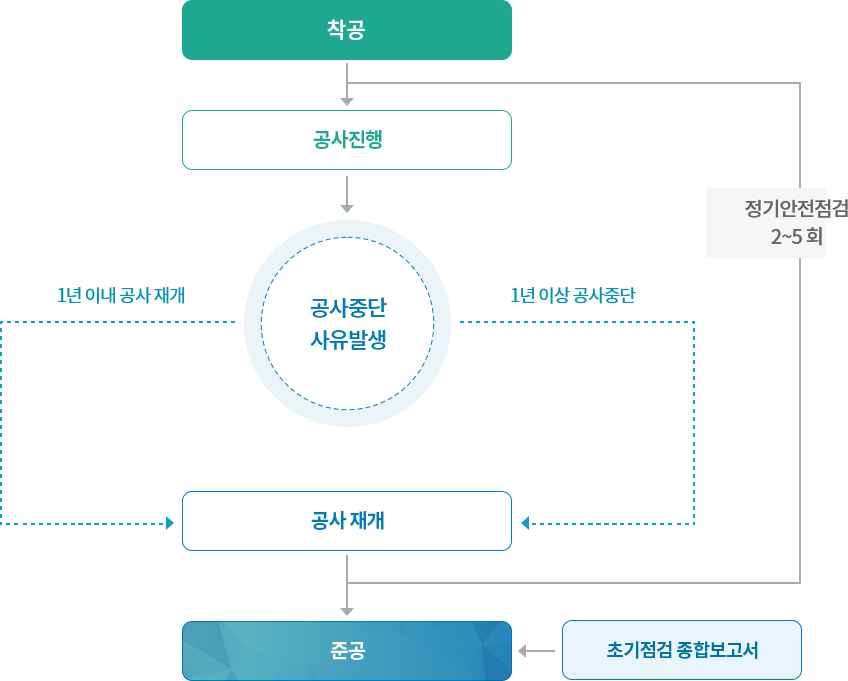 구분 : 정기안전점검, 초기점검, 공사 재개전 안전점검(1년 이상 공사 중단 후 재개시), 정밀안전점검(필요시)