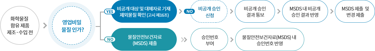화학물질의 안전한 사용을 위하여 물질안전보건자료(MSDS) 대상물질을 제조하거나 수입하기 위한 물질안전보건자료(MSDS)작성·제출과 제조사의 영업비밀을 지키기 위한 비공개 승인을 보장합니다.