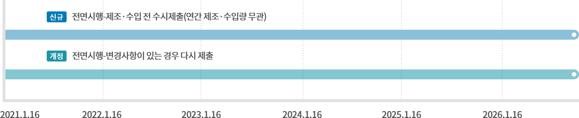2021년 1월 16일 ~ 2026년 1월 16일 신규 : 전면 시행 - 제조·수입 전 수시제출(연간 제조 ·수입량 무관) 개정 : 전면 시행 - 변경사항이 있는 경우 다시 제출